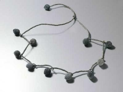| Beschreibung: | Schmuck aus Rocailles Perlen (Glas), Beerelikette in Grautünen, handgeflochtene Zwischenstücke aus Papiergarn |